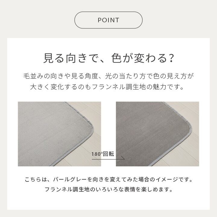 生地に抗菌・防臭加工を施した、ラグカーペットです。多色展開ですので、お部屋に合わせてお好きなカラーをお選び下さい。表地にはフランネルと呼ばれる、しっとりとして非常に柔らかい生地を使用しています。軽量で持ち運びが楽々です。薄手で小さく折りたたむことができますので、収納時にも場所を取りません。フローリングを傷つけにくいよう、裏には不織布を貼っています。ご家庭の洗濯機で洗えるウォッシャブル仕様ですので、清潔にご使用頂けます。電気カーペットカバーとしてもご使用頂けます。季節を選ばすオールシーズンご使用頂けます。多サイズ展開で、ワンルームから子ども部屋、リビング・ダイニング、ベッドサイド、ソファ前にも。いろいろなシーンに合わせてお選び下さい。