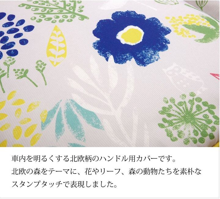 北欧テイストを取り入れた車のハンドルカバーです。北欧の森をテーマに花やリーフ、森の動物たちを素朴で味のあるスタンプタッチで表現しました。明るいカラーとデザインで車内を明るく楽しく演出します。幅広い年齢の方にお使い頂ける商品です。サラッとした肌触りなので年間を通してご使用頂けます。日よけ、汚れ防止のハンドルカバーですが、運転中は座席の上に置いてクッションとしてもご使用頂けます。また、チェアパッドとしてもご使用頂けます。中材にはウレタン10mmを使用しておりますので適度なクッション性があります。