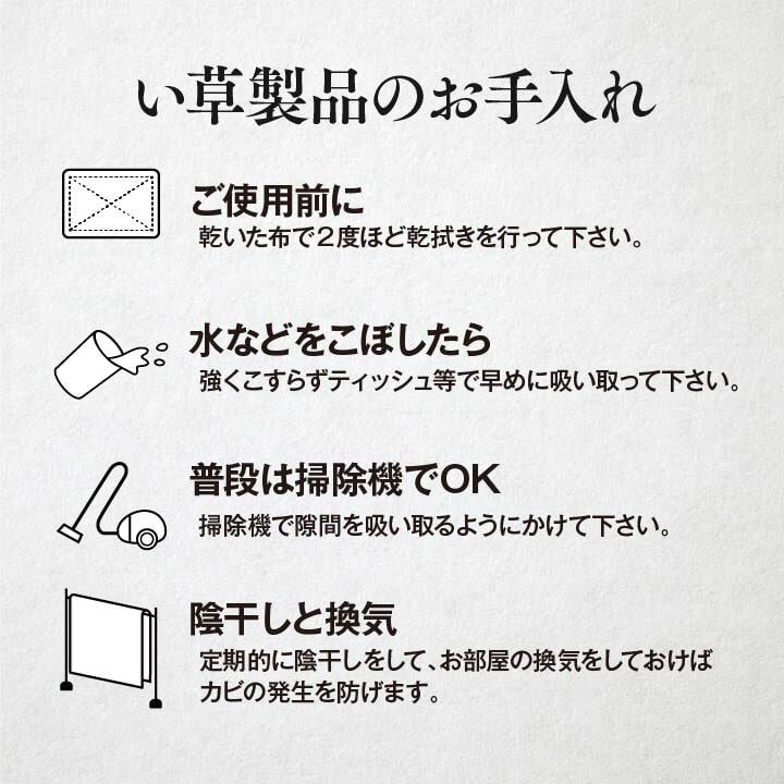 市松柄でシンプルなデザインに仕上げたイ草花ござカーペットです。花ござを敷くだけで畳のお部屋をリフレッシュ出来ます。日焼けしてしまった畳のリフレッシュに、新品の畳を汚さない為のカバーにご使用下さい。い草には空気の自然浄化作用、湿度の調節作用などがあり、汚れにくいという特長があります。い草に青森ヒバ加工を施しています(抗菌・防臭効果)。青森県のヒバの木から抽出した「ヒバ油」をメーカー独自の技術で材料や商品に加工しました。「ヒバ油」には、ヒノキチオールという天然物質としては極めて抗菌性の高い成分が含まれ、医療や食品など多分野で利用研究が進められています。※自然素材であること、また職人が一つ一つ手作業にて加工を行うため、形状のバラつきや表示サイズと多少異なることがあります。ご了承下さい。