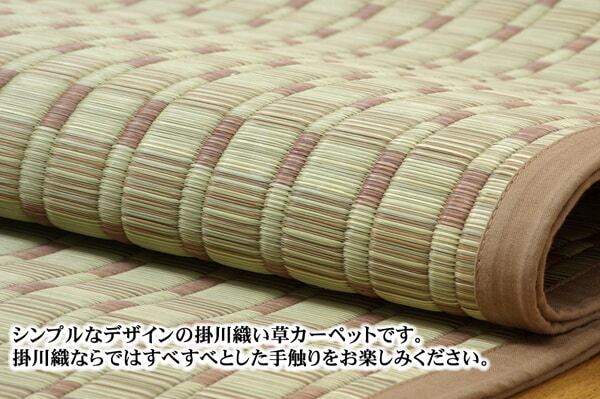 掛川織は九州筑後地方の伝統的な織り方です。大きな目と小さな目に交互に織り込んだ美しく洗練されたモダンなデザインが人気です。また、厳選された良質の太く長いイ草を高密度に織り込んでいますので丈夫で耐久性があり、しかも素足に心地よいクッション性とボリューム感があります。国産(九州産)のい草を使用しています。一本一本が太く、表皮が厚く繊維がキメ細かいので弾力性があり、耐久性に優れています。い草には空気の自然浄化作用、湿度の調節作用などがあります。また汚れにくく、使用するうちに黄金色に変化し味が出ます。い草に青森ヒバ加工を施しています。(抗菌、防臭効果)